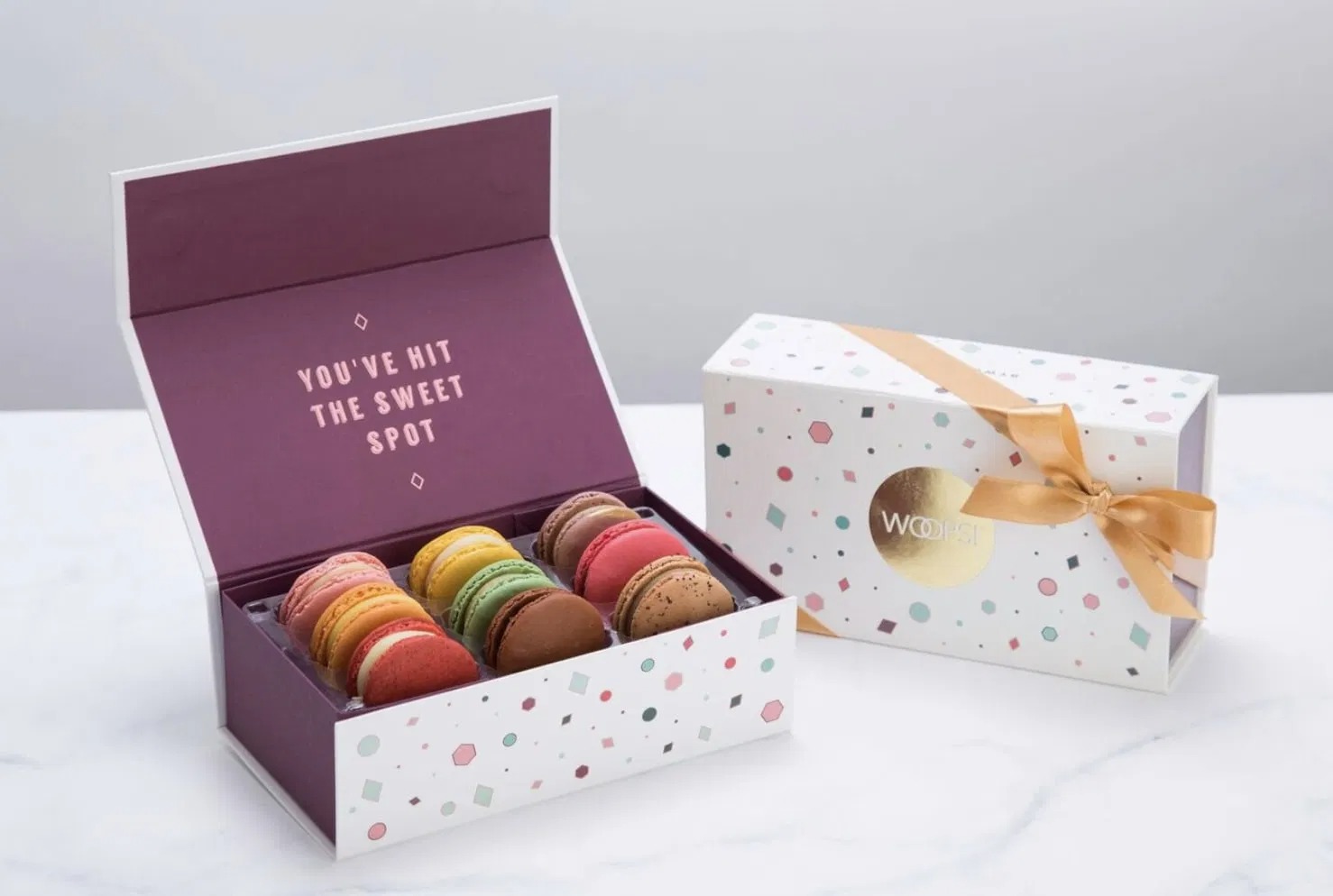 Our boxes are sold in various sizes to be able to accommodate a single macaron to large quantities in anticipation of gifting or special events. Add additional die-cut windows to allow customers a peek inside, or consider different finishes like embossing, foil stamping, and ribbons to make your packaging really unique. These boxes leave an impression whether used in weddings, birthdays, or in bakery sales.